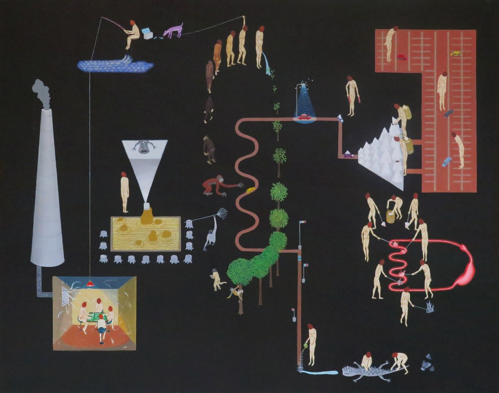 A succession of events unfolds in each painting but there’s no linear temporality recalling to mind Bosch’s Garden of Earthly Delights with the difference that Ikezoe’s cabezas de coco act in a flat and monochrome surface, positioning his characters in a bidimensional pictorial space where time is suspended. Chaos reigns but in an orderly fashion making us reflect about our own organization and again about the true meaning of life.