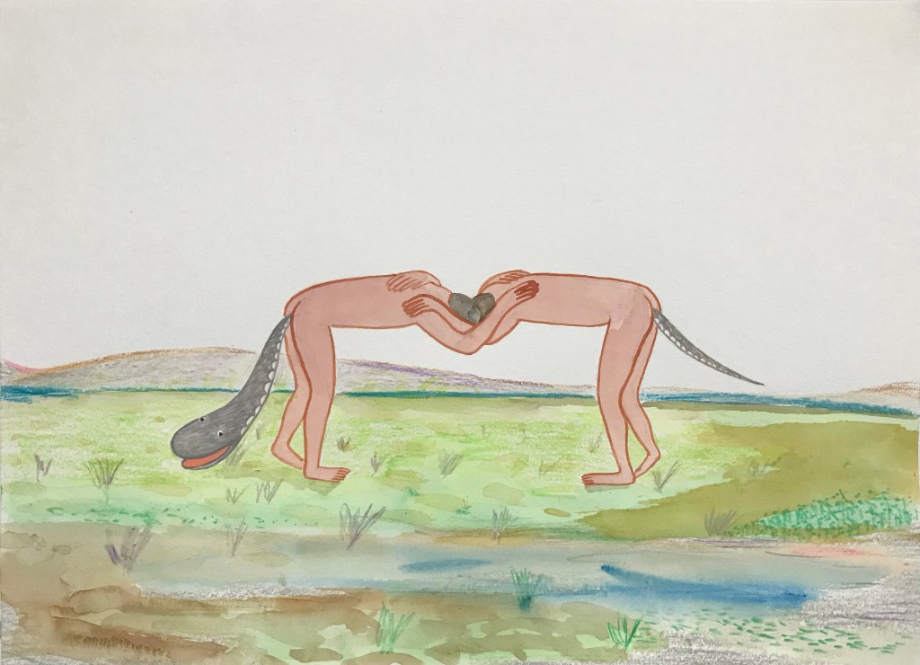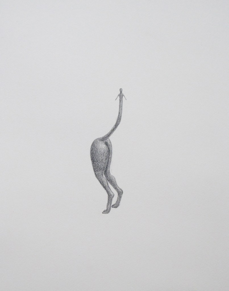 For example, in his series Outside In, hybrid beings engage in odd and absurd activities, they seem entrapped in contradictory situations preventing them to proceed with their lives. The characters evoke Medieval bestiaries in which animals were thoroughly described while preaching christian values; like in such books, these representations are permeated with symbolic meanings but in Ikezoe’s case, the message is less pious. Inspired by the earthquake and tsunami that shook Japan and provoked a nuclear disaster in Fukushima, Ikezoe sought for an alternative to capitalist interests in Japanese folklore. “Like many Japanese people, I started doubting the rationale behind nuclear plants and also capitalism as the ground on which nuclear energy was blindly justified. I started focusing on the strange world of myth and folklore in search of “irrational” and “illogical” thinking, the kind that wouldn’t fit in today’s society.”