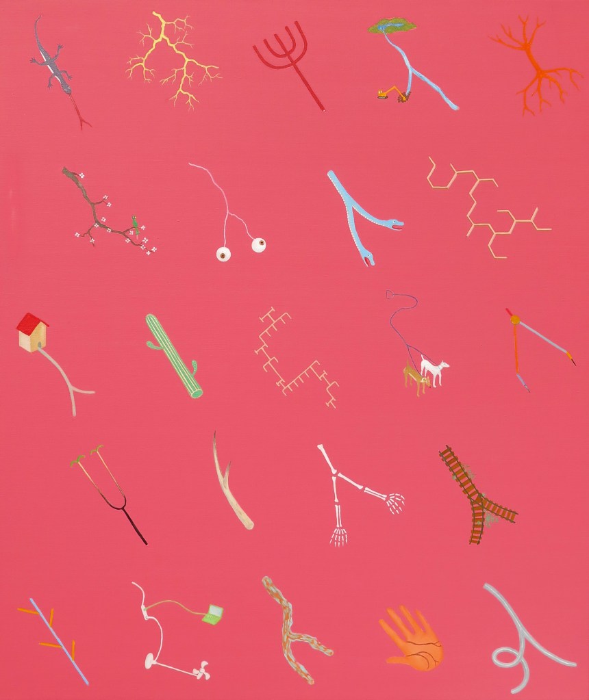 There is a leitmotiv in Ikezoe’s work which manifests in series like Milky Way and it consists of classifying objects. When the artist arrived in New York in 2011, he struggled with the barrier of language, so he communicated through objects and the visual images that he painted. Classification became thus the artist’s strategy to apprehend the world and by categorizing objects depending on their shapes and visual characteristics, Ikezoe created an atlas akin to Aby Warburg’s project Atlas Mnémosyne. Form instructs the painting’s structure, every object regardless of its triteness is material to be indexed and corresponds to a specific typology, to a specific system of knowledge conveying perhaps a hidden meaning, a hidden order.