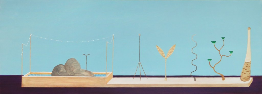 What Ikezoe shows in his paintings are images of a nature that is mixed with objects created by men, nature is not presented as a pristine landscape but a compound of plastic and plants, a new entity finding its true meaning in the Anthropocene with the disruption of nature by capitalist interests. Furthermore, Future Primitive is an attempt to show an imaginative future without humans, and in this scenario objects would chronicle our passage. An eerie feeling is conveyed through the lines that punctuate each composition, the stillness of it all reinforces the gloomy scene. Even if man made objects populate these works, their sepulchral silence foretells our dismay; contrasting with its bright colors these paintings can be looked as epitaphs of our civilizations.