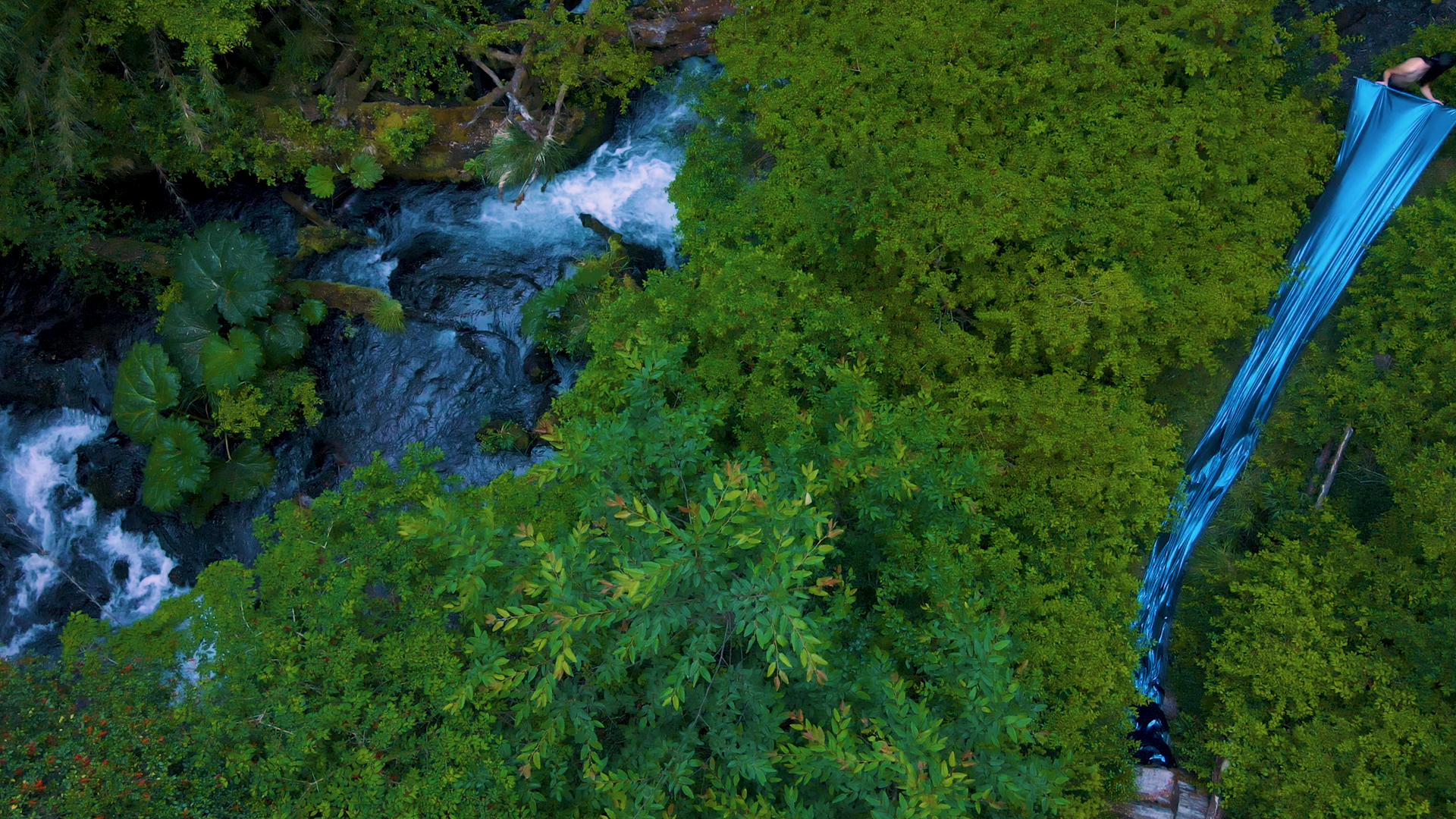 Their work celebrates the memory and struggles of their people over the past centuries. For example, in one of their videos titled Tray Tray Ko (2022), Calfuqueo is seen descending toward a cascade. They carry a shimmering blue mantle through the woods, while the sound of bells — hanging from their hair — punctuates each movement, giving rhythm to the scene. The landscape is lush and verdant; as they approach the waterfall, their body merges with the cascade, creating a unified entity. In the artist’s vision — and by extension, in the Mapuche worldview — nature and humanity are not to be separated, but rather regarded as an intertwined organism, a web of entanglements connecting all beings. Territories, landscapes, and nature are breathing entities that escape rigid categories. They move and change over time, contradicting outdated conceptions such as natural selection or competitiveness within the “natural” sphere. Another of their works, Spores (2021), shows the artist in the middle of a forest surrounded by trees, rivers, and stones, emphasizing the synergy between ecosystems and human bodies.