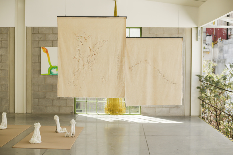Her exhibition Con mi dedo trazo el camino del agua at Museo Carrillo Gil in Mexico City presented a nest-shaped piece designed to invite viewers into dialogue on climate change and its effects. Connection with her audience has been key for Alarcón. Her role as a teacher and workshop coordinator has made her particularly attuned to transmission — of skills, memory, care. Just as important is her connection to her heritage, her motherland, her kinship. Donde crecen los claveles, for instance, is dedicated to her mother and to Chile: two translucent fabrics bear red flowers suspended above the ground, while beneath them lie red carnations. The piece alludes to victims under Pinochet’s regime and the collective process of grief. What is the impact of such wounds on memory? How can we live in the present while still honoring our ancestors? To find answers, Alarcón sought inspiration in Chile’s arpilleras — dissident women who stitched patchworks during the dictatorship to sustain their families. Their sewing was survival, but also defiance: textiles became an extension of their bodies, stitching together protest and hope.