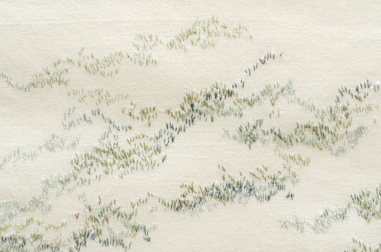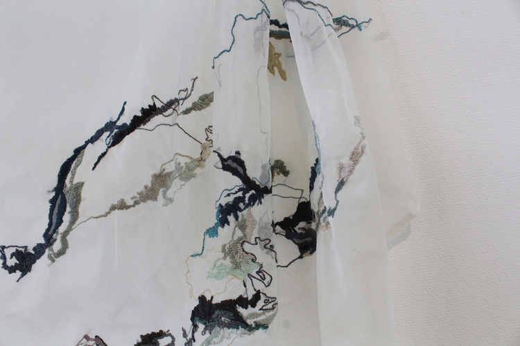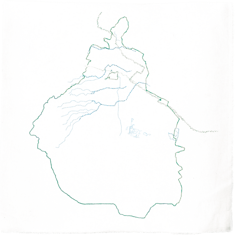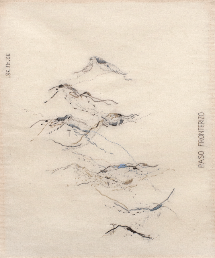 For Alarcón too, embroidery is tethered to the body. When recalling her first encounters with textiles, she evoked the image of a scar healing, thick like a seam: “my body was seaming.” Cloth, like skin, holds memory. For her, the medium became a second epidermis, porous and fragile. This relation extends to her sense of belonging. Accustomed to Chile’s topography — its sea, its Andes — she felt engulfed upon relocating to Mexico. To survive, she began embroidering maps, transforming vast territory into tangible cartographies. In Atlas de memoria, abstract landscapes unfold as threaded memories, each line a trace, each stitch a latitude. Though elusive, these maps anchor her story to the earth, locating her both symbolically and literally.