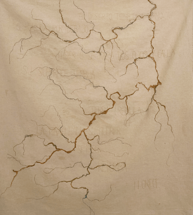 “In the particular is contained the universal.” Alarcón’s textiles narrate dislocation but extend toward collective experience. Migration, exile, climate change — these are the movements of our time, shared by humans, animals, even rivers. For her, body and landscape are one: stitched, porous, scarred, resilient. With each embroidery she embraces life’s fragile seams, echoing her own fractured body and soul. She is against walls and fences; she is for collaboration, exchange, conversation. Poetry offers solace. Thread becomes breath. She stitches to endure, to outlast our fleeting existence.