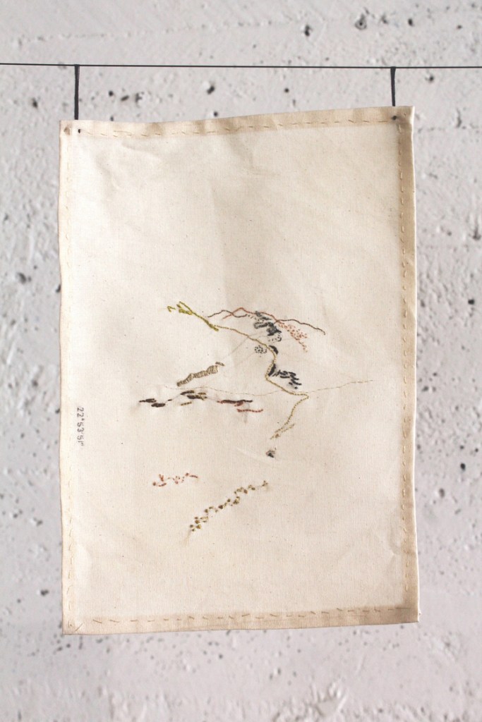In the last ten years, we’ve seen an increasing interest in textile artworks. Artists such as Anni Albers, Sonia Delaunay, Sheila Hicks and more seized the medium, introducing crafts into the fine art canon. But it was not until the 1970s that textile became an ally for feminist artists, a political space where women could challenge patriarchy. Inheriting from these pioneers and mother figures, Antonia Alarcón’s work continues where previous textile artists left off. Her work, inhabited by a pastel color palette and embroidery, may at first glance seem “girly” and candid. However, each piece is both personal and political: an account of the artist’s journey and her relation to place.
