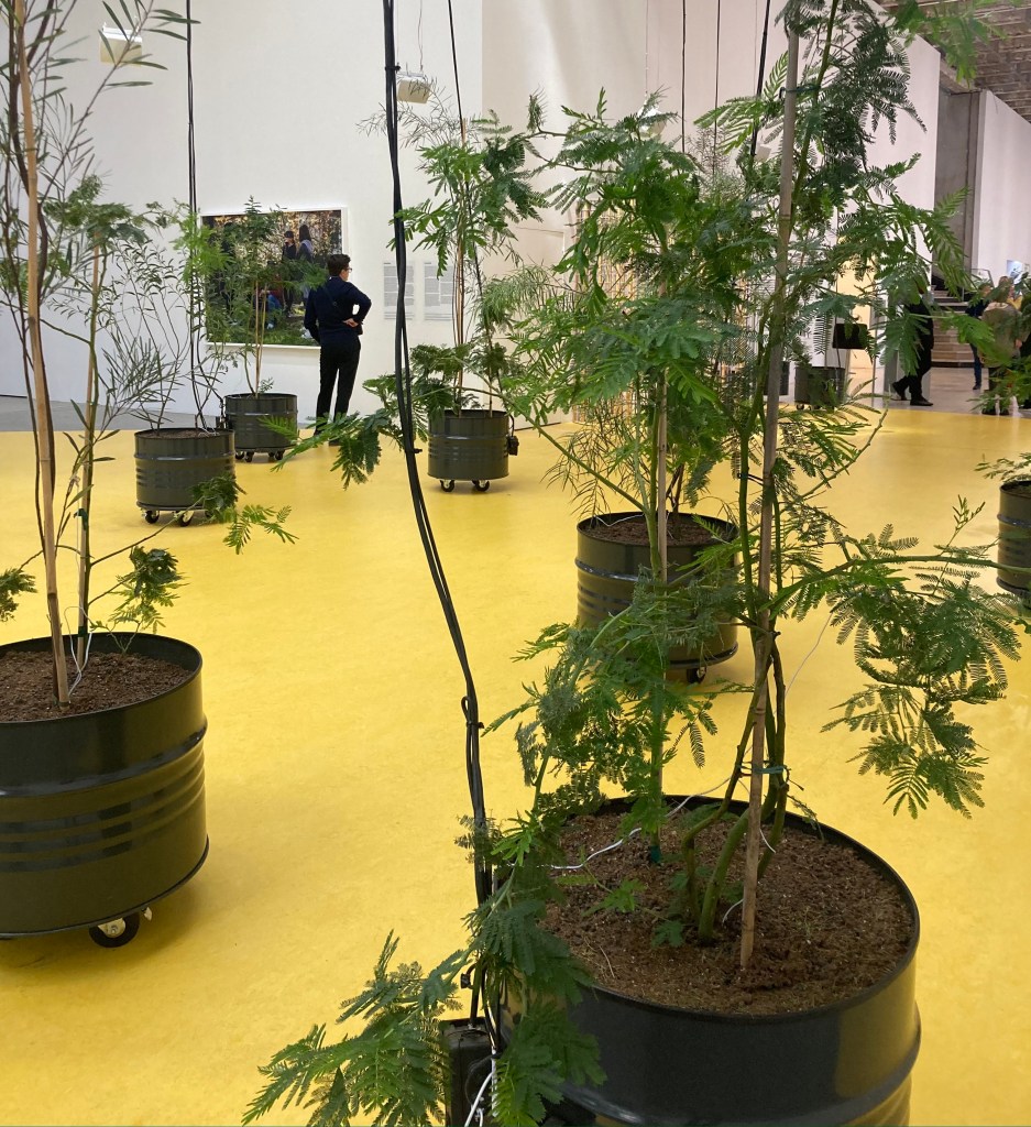 As we go through two grids subtly positioned at each end of the entrance, we are greeted by a lush interior with blooming acacias on pots. The yellow carpet on the floor––part of the artist’s project Brutal Family Roots presented during the Sydney Biennial in 2020––echoes the color of the flower while also signifying treachery. For the artist, acacias are imbued with personal meaning, they are tied with childhood memories representing his own private Ithaca. However, the plant is not autochthonous to Northern Africa, it was brought by colons to the territory from Australia resulting in dismantling the artist’s own mythology. So, a symbol of the region is in fact contaminated by encounter, the story of colonization is not monolithic and the journey of these plants––rendered possible by globalization––unveils the hidden connections between remote geographies. The installation raises the question of what constitutes an identity, is there such a thing as “purity”? When examining concepts like nationhood or exoticism it’s always a matter of perspective.